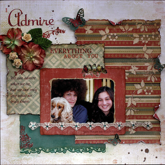 Made this LO pretty simple by layering the pp's and outlining the floral design with a fineliner pen to accent the design. I added a touch of lace and a cluster of Prima flowers then grunged it up with a bit of paint, ink. rubons and distressing.