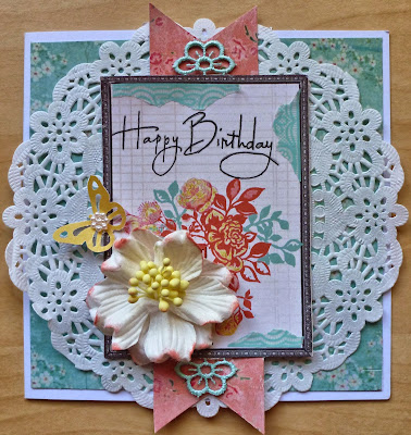 This is my example of the canvas. I have used tissue paper on the background for some texture, which was misted, then masked with gesso and splattered with a contrasting mist. The canvas was edged with layers of mesh tape, washi tape and some punched borders to create a frame. A few pieces of distressed and grunged patterned papers and lace were used to frame the photo, and some pretty flowers were added in clusters. The gorgeous diecut frame bordering the title word is from Manor House Creations and ties in beautifully with the shabby chic look of the canvas.
